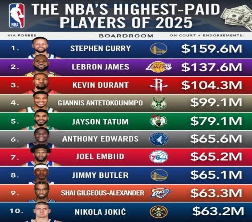 12月26日,美媒公布了2025年NBA球星收入,其中库里力压詹姆斯排名第一位,杜兰特排名第三位,塔图姆、爱德华兹等球星纷纷上榜。