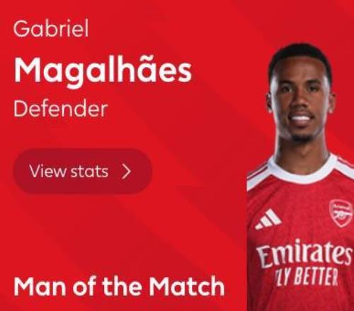 攻防俱佳,加布里埃尔当选伯恩利vs阿森纳全场最佳球员